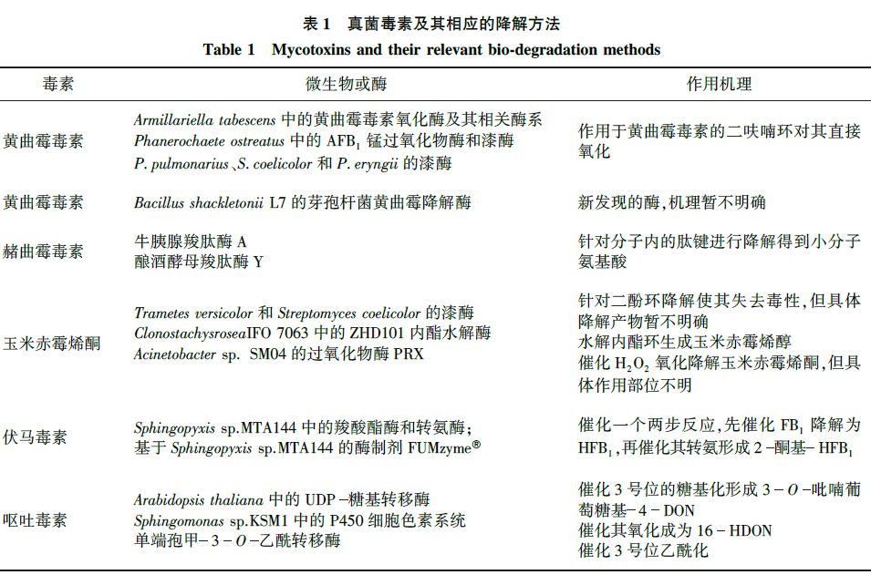 研究者針對黃曲霉毒素、赭曲霉毒素、玉米赤霉烯酮、伏馬毒素和嘔吐毒素均開發了相應的降解酶(表1),下文將具體闡述。